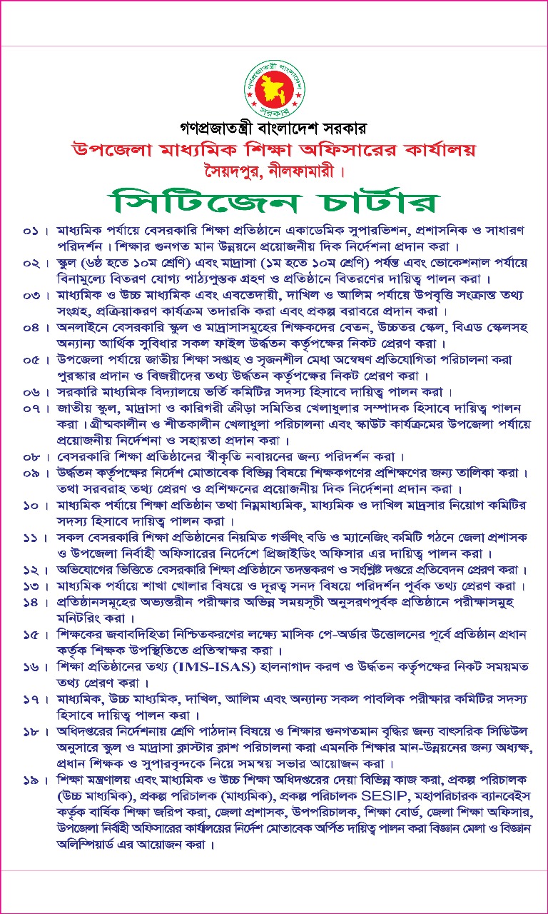 শিক্ষা মন্ত্রনালয়, অধিদপ্তর, প্রকল্প পরিচালক স্নাতক, উচ্চ মাধ্যমিক, মাধ্যমিক SESDIPE এবং পরিচালক ব্যানবেইস, জেলা প্রশাসক, শিক্ষা বোর্ড, উপ পরিচালক রংপুর অঞ্চল, উপজেলা নিবাহী অফিসারের কাযালয়ের নির্দেশ মোতাবেক অর্পিত দায়িত্ব পালন।