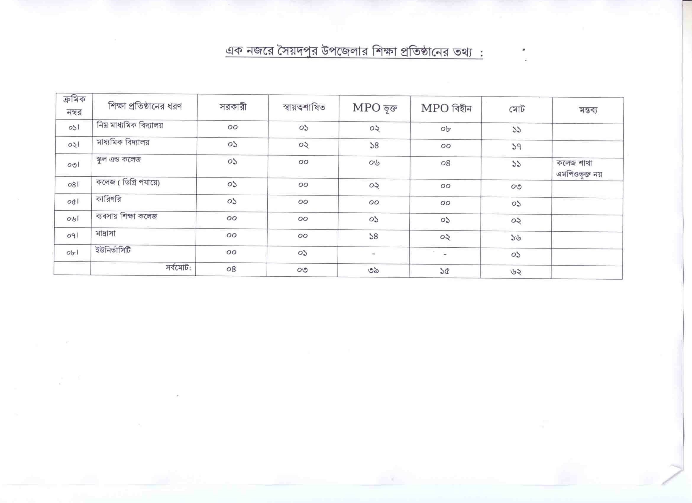 সৈয়দপুর উপজেলার নিম্ন মাধ্যমিক ও মাধ্যমিক বিদ্যালয়, স্কুল এন্ড কলেজ, কলেজ, কারিগরি কলেজ এবং ব্যবসায় শিক্ষা কলেজের সারসংক্ষেপ।